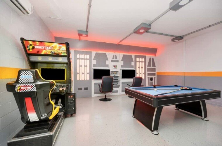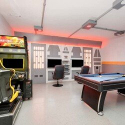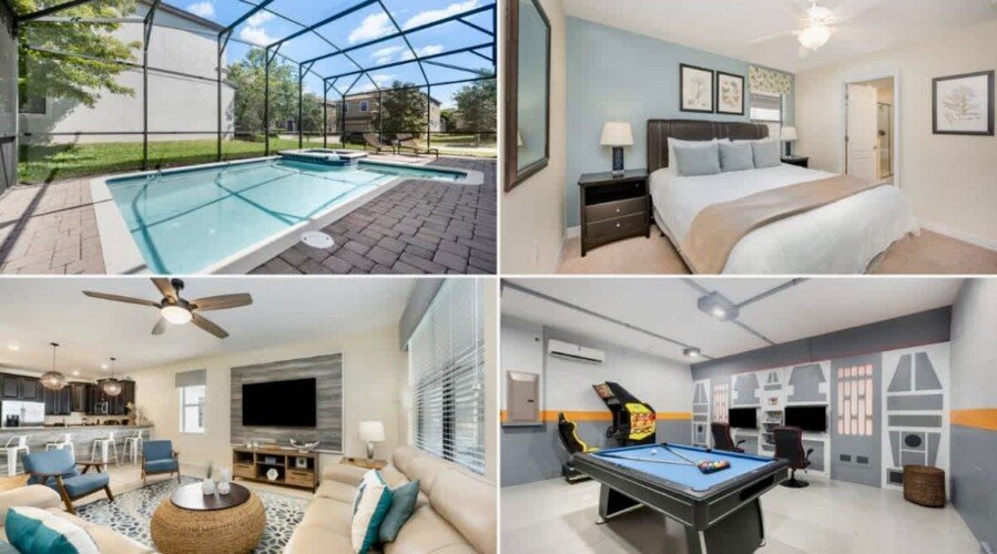 Escape to luxury at our 9-bedroom, 5-bathroom villa in Champions Gate Resort, just minutes from Disney World and Orlando’s top attractions. Enjoy a private pool, game room, and modern amenities. The community features a state-of-the-art gym, movie theatre, heated pools, lazy river, splash zone, and more.