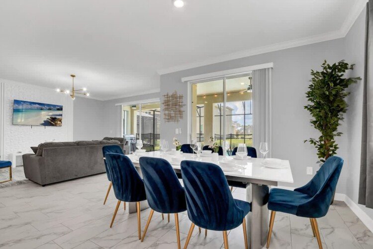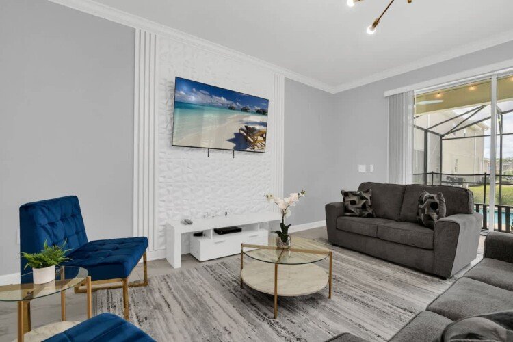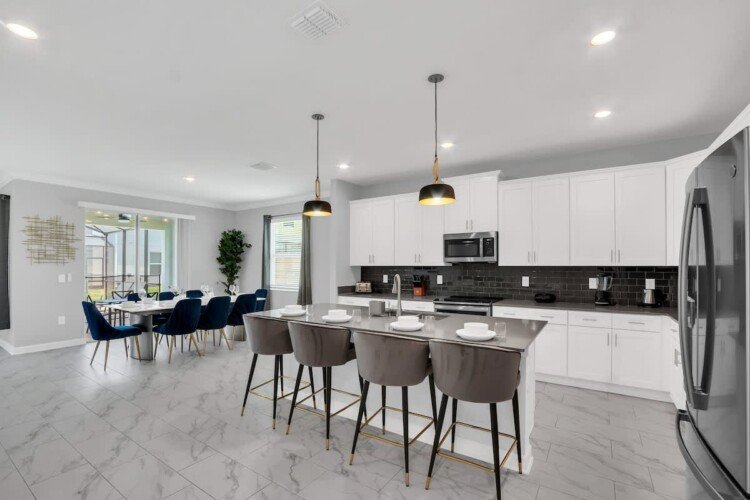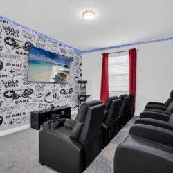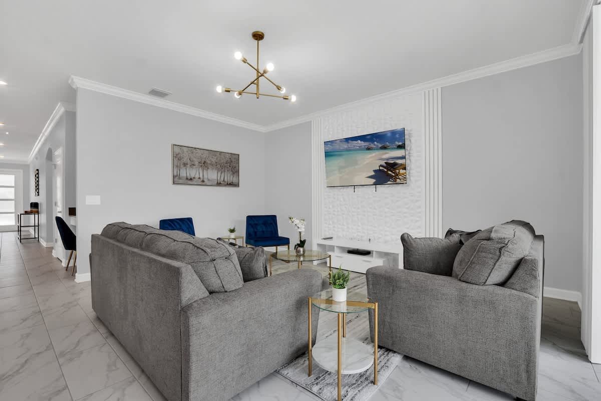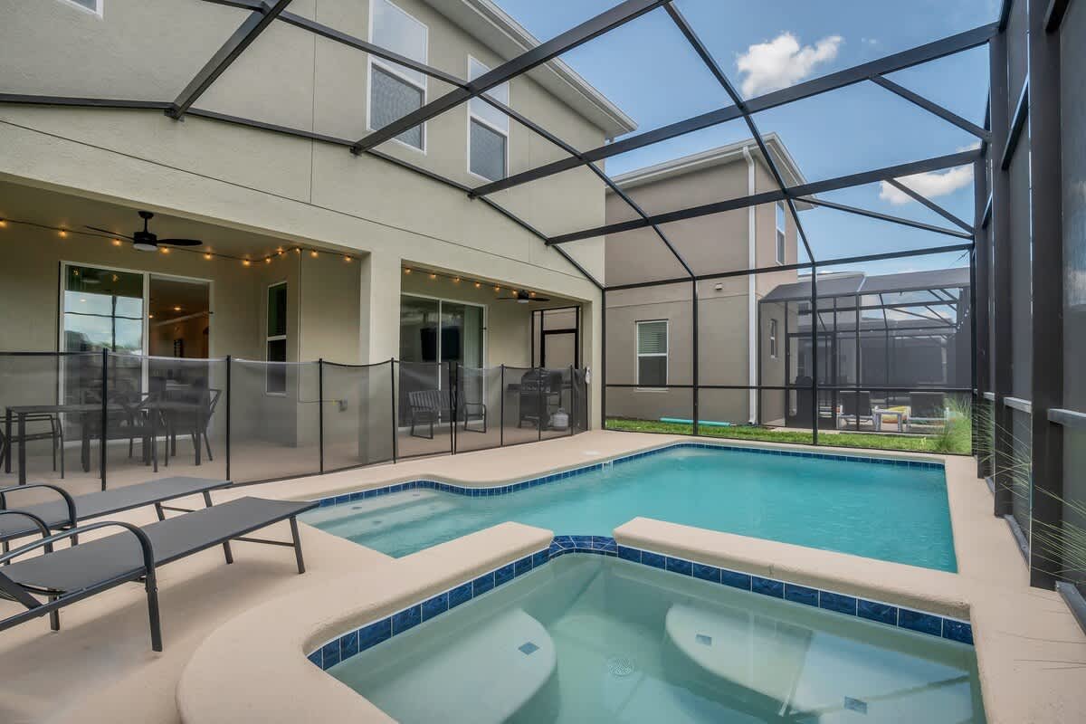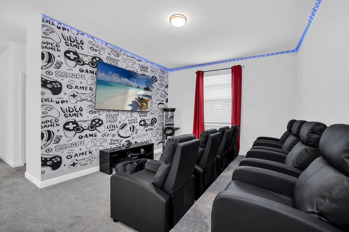 Welcome to our gorgeous villa near Disney! Brand-new 6BR/5BA in Storey Lake Resort with private pool, spa, Italian furnishings, OLED TVs, theater, full kitchen, and BBQ grill. Free high-speed Wi-Fi, cable, and Netflix. Minutes from Disney, Universal, SeaWorld, outlets, and dining. Resort perks include a lazy river, pools, a splash pad, a tiki bar, a fitness center, a spa, and lake activities.